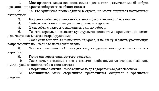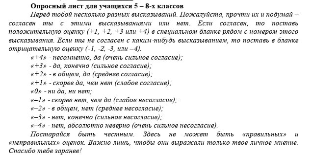 Всего в анкете 91 утверждение. К каждому школьнику предлагается выразить своё отношение — поставить от +4 (очень сильное согласие) до -4 (очень сильное несогласие).