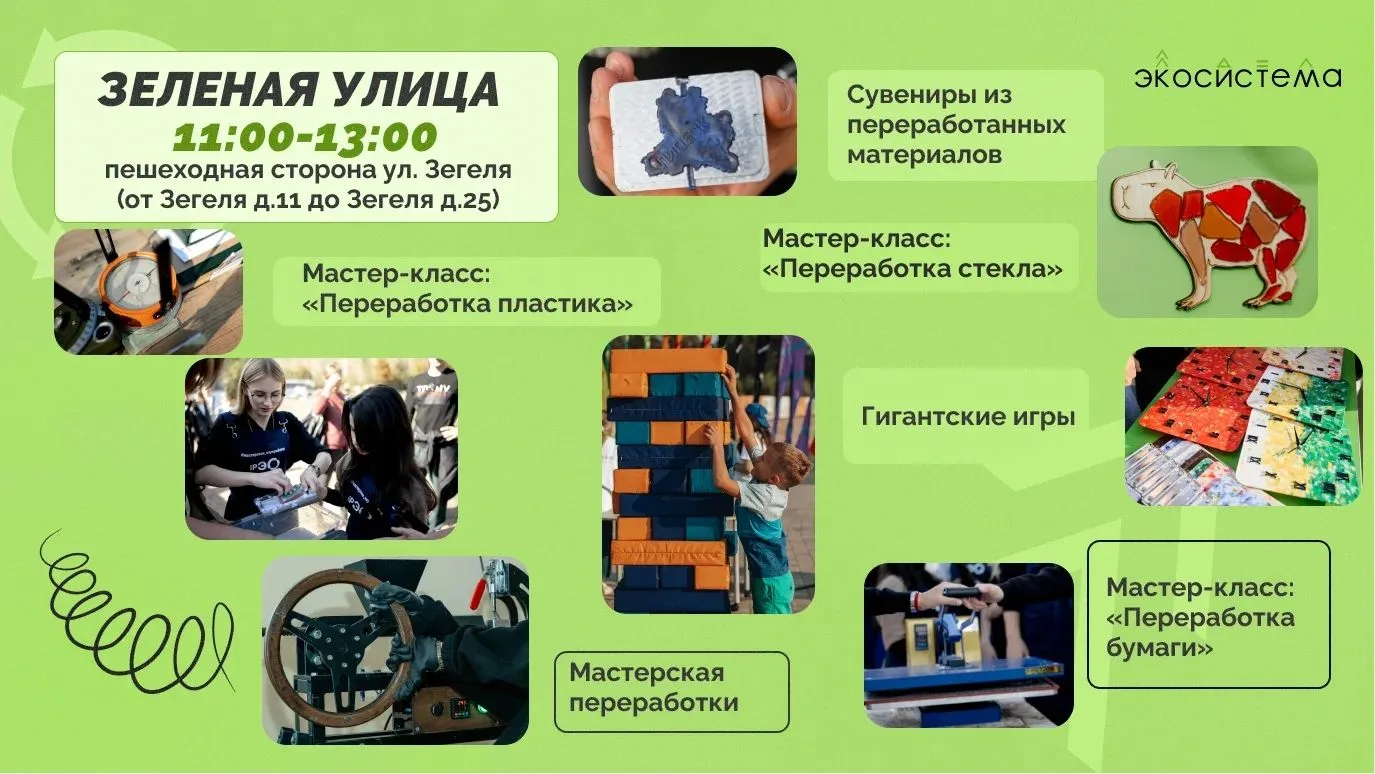 Также ул. Зегеля превратится в «Зелёную улицу», на которой волонтеры проведут серию просветительских игр и мастер-классы по переработке пластика, бумаги и работе со стеклом