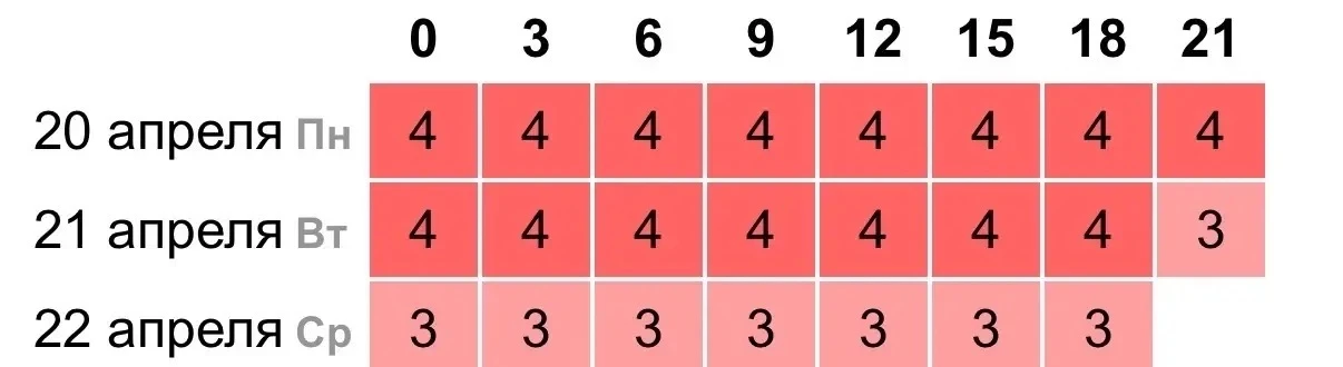 По прогнозам специалистов, с 20 по 22 апреля показатели сохранятся на уровне 4 баллов, а к концу периода ослабнут до трёх.