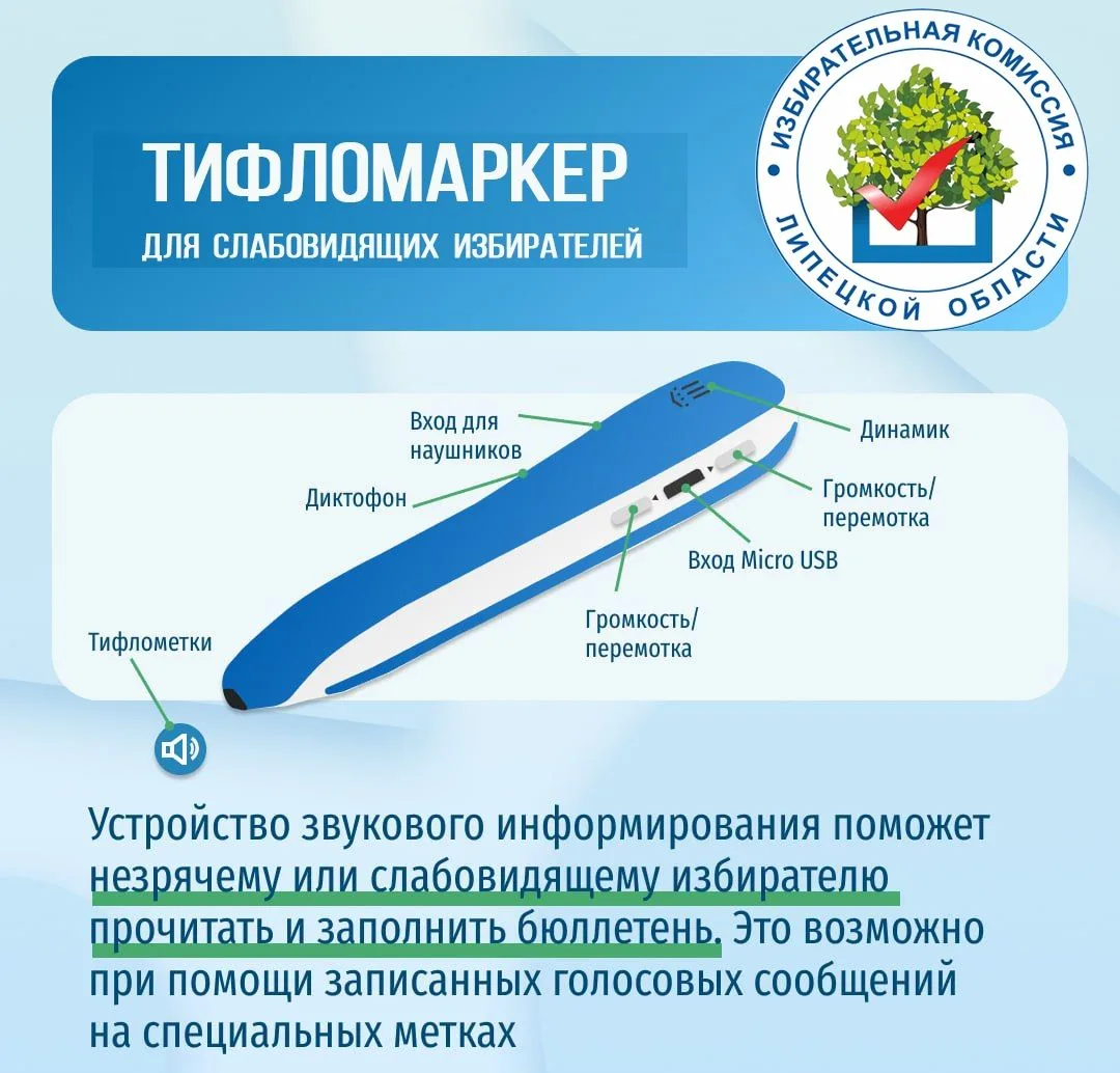 Информация о кандидатах продублирована шрифтом Брайля. На участках есть указатели с номерами УИК - тоже с рельефно-точечным шрифтом. Также выдаём тифломаркеры — это ручки, которые озвучивают написанное.