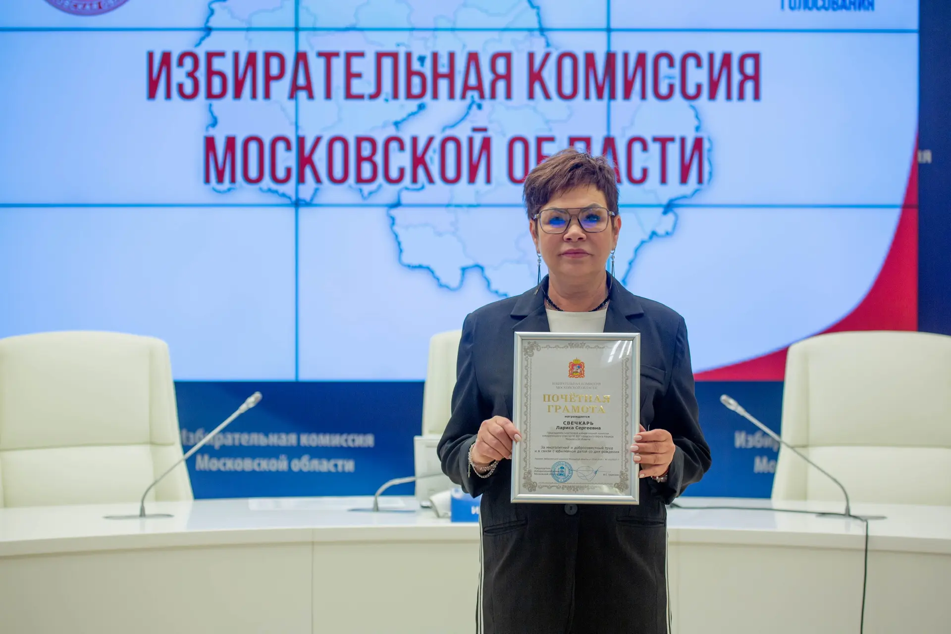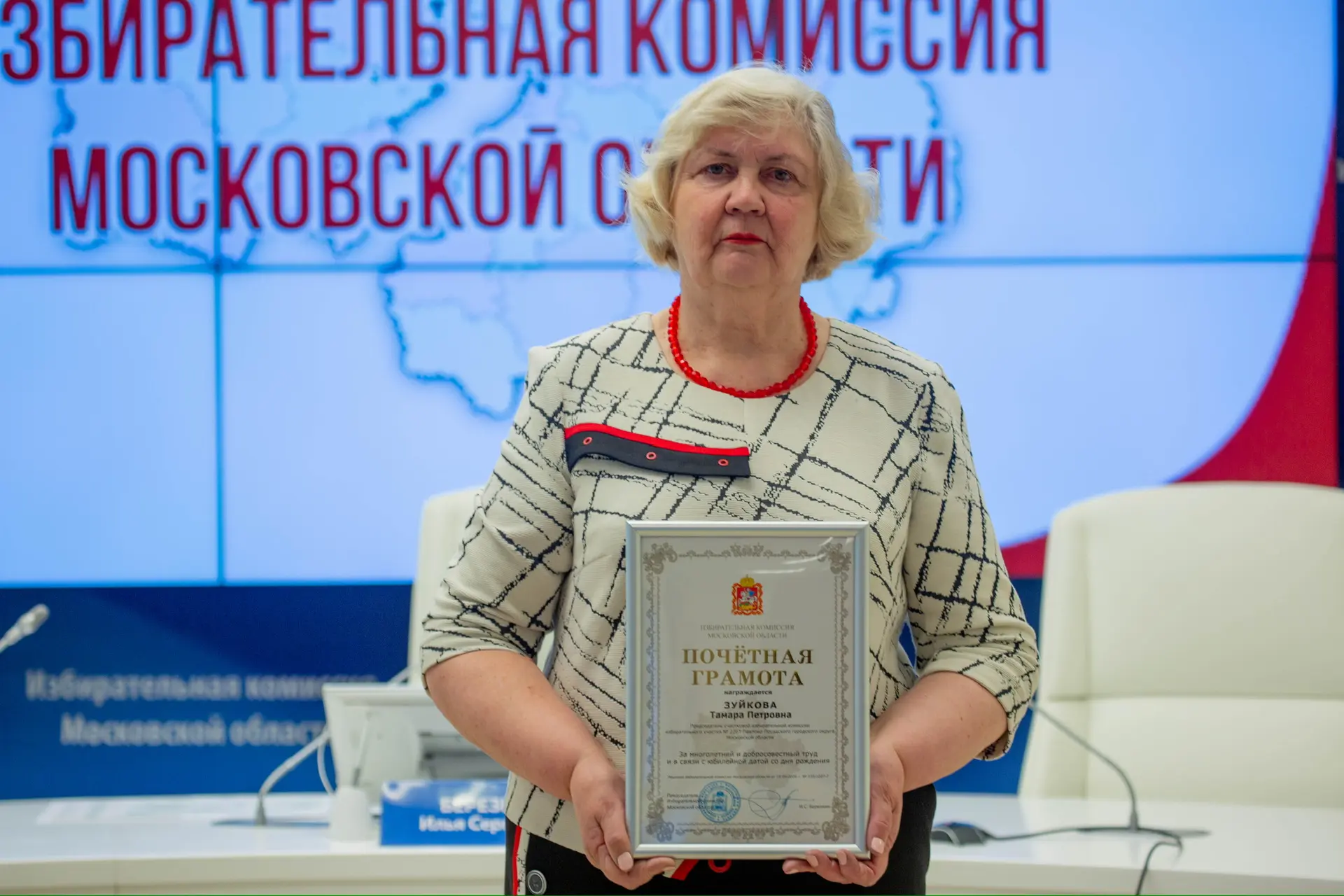 Тамара Петровна - председатель УИК №2267 из Павловского Посада, ее отметили почетной грамотой как и председателя УИК №807 из Каширы Ларису Свечкарь, а также председателя УИК №1591 из Можайска Елену Бербек.