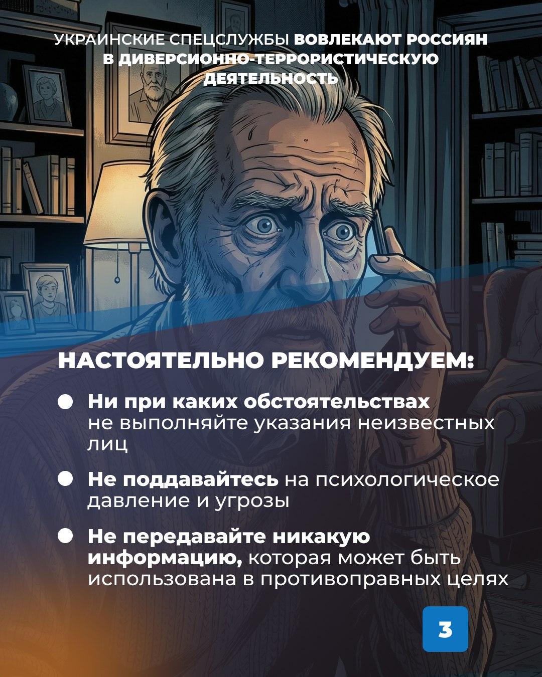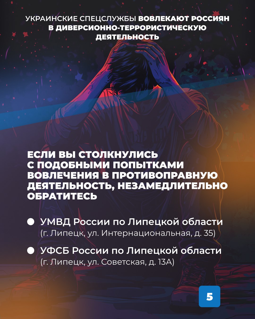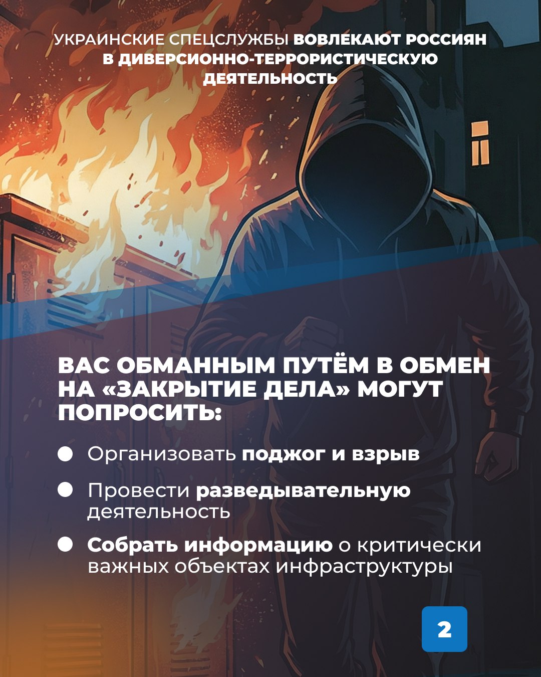 Сейчас украинские спецслужбы активно вовлекают россиян в противоправную деятельность. Будьте внимательны! Не доверяйте незнакомым людям, не поддавайтесь на угрозы и психологическое давление.