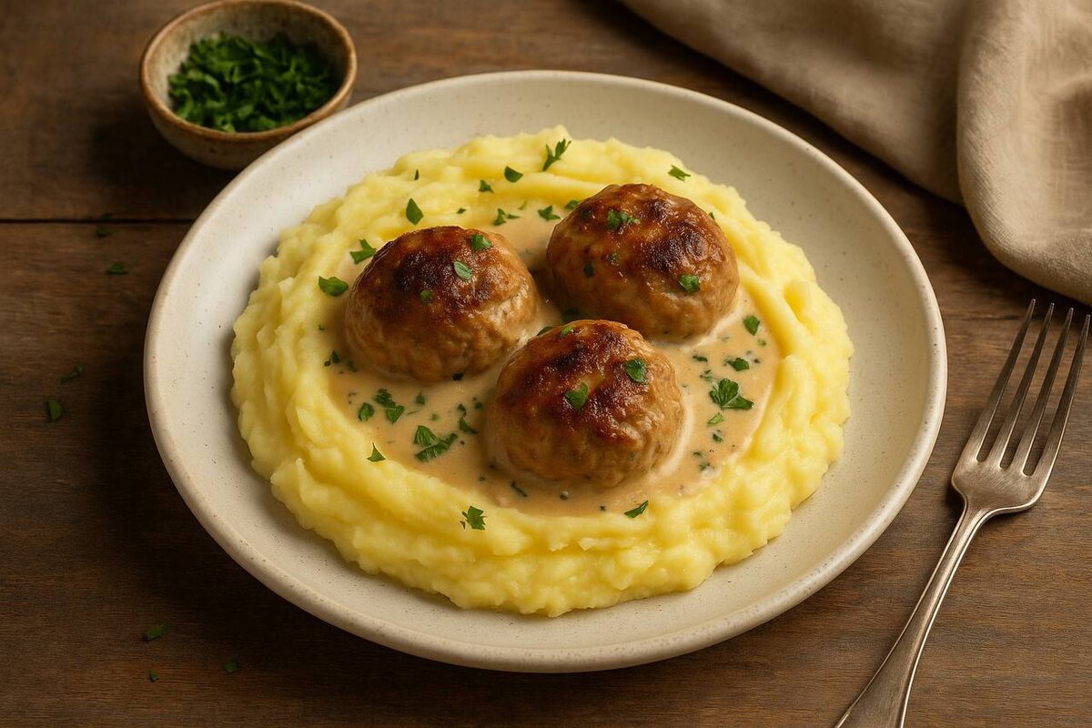 6. Подача: Выложите пюре на тарелку, рядом разместите тефтели, полив их щедрой порцией соуса.