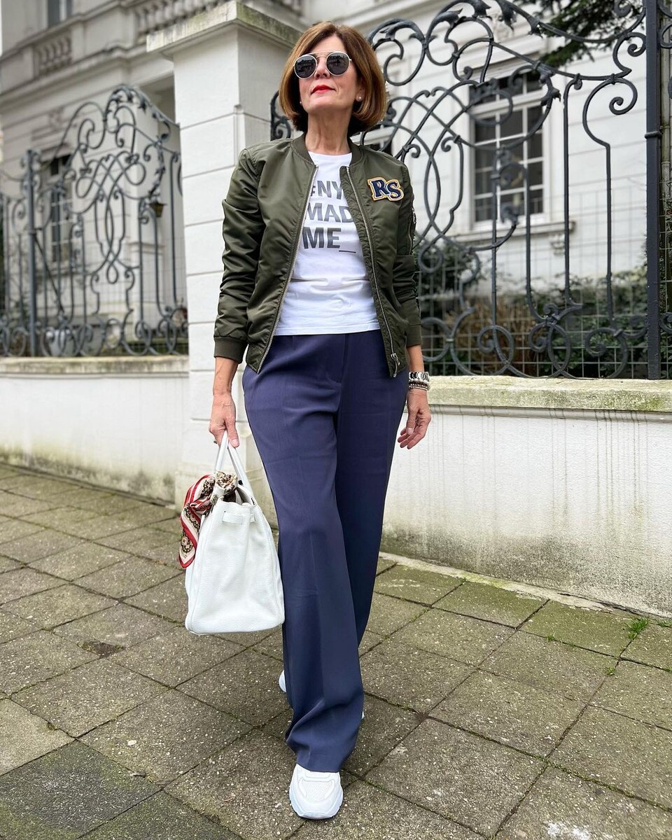 1. Прямые темно-синие брюки в сочетании с белой футболкой с черным надписем и хаки курткой-бомбером создают непринужденный, но стильный образ. Объемная белая сумка с ярким платком на ручке станет отличным завершением этого «лука».