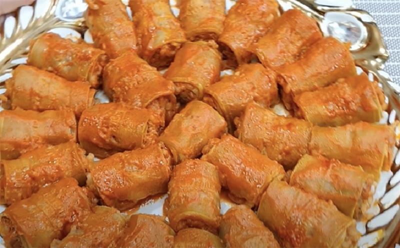 Для начинки подойдёт любой мясной фарш. Рис можно использовать как сырой, так и слегка недоваренный: в процессе готовки он впитает ароматы соуса. Для получения лучшей консистенции фарша нарежьте лук очень мелко, а добавление специй, таких как зира и паприка, придаст рулетикам особый вкус и аромат.