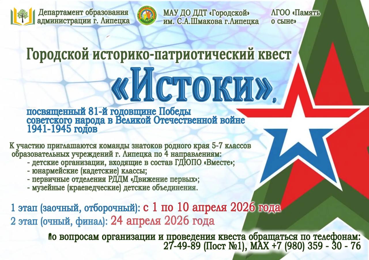 Юных липчан приглашают к участию в городском историко-патриотическом квесте «Истоки»