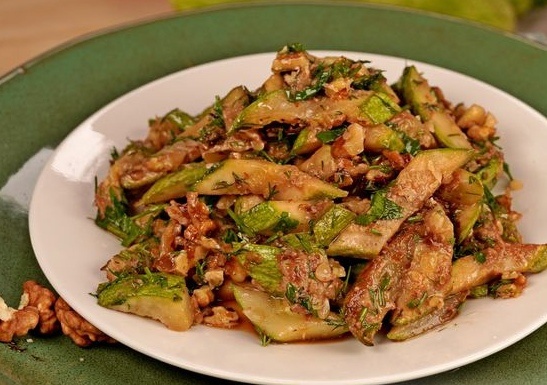 Салат из жареных кабачков — это не просто закуска, а настоящее гастрономическое открытие для ценителей оригинальной кухни. Здесь нежные кусочки кабачков обжариваются до золотистого цвета и комбинируются с хрустящими грецкими орехами, свежей зеленью и ароматной заправкой. Каждый ингредиент в этом блюде создает гармоничную симфонию вкусов, которая точно не оставит никого равнодушным.
