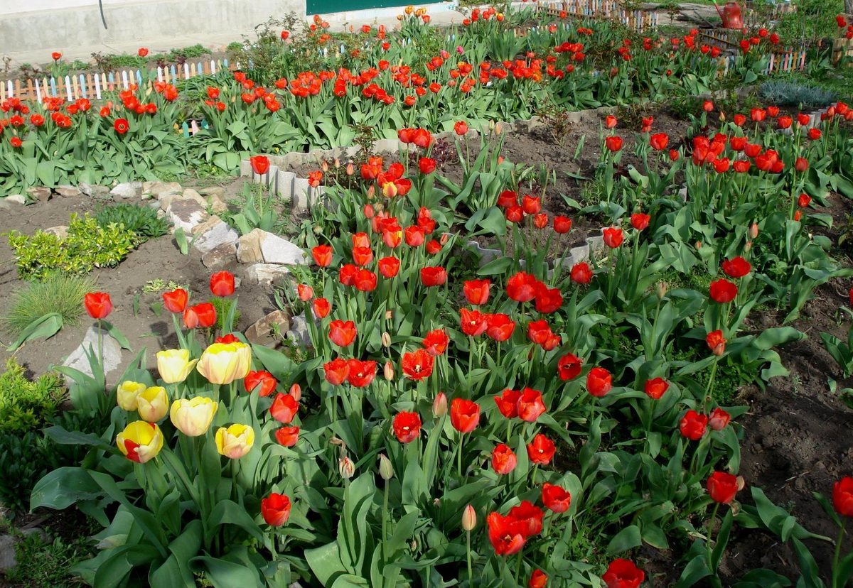 Соседство с многолетниками, такими как хосты, обеспечивает не только маскировку увядших листьев тюльпанов, но и гармоничное сочетание растений на вашем участке.