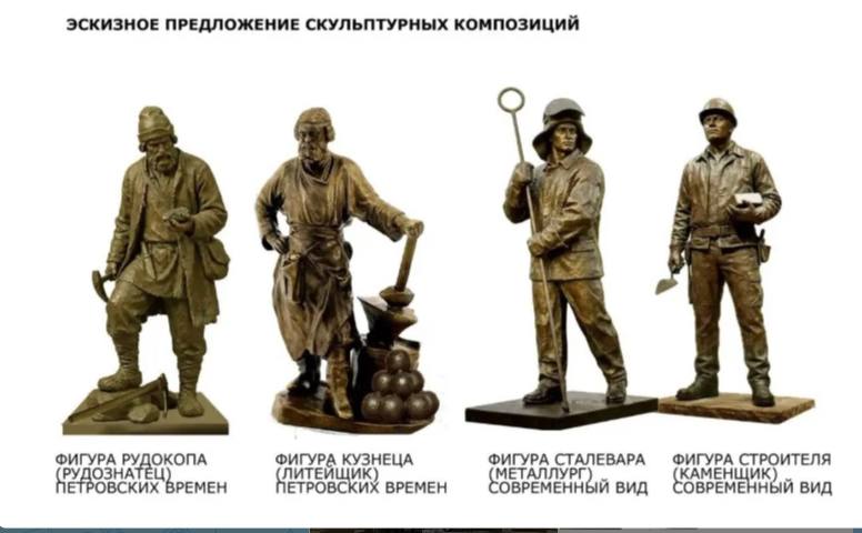 Фигуры «Петровских времен» – рудознатец и кузнец-литейщик символизируют первооткрывателей и мастеров.