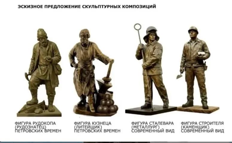 Авторы предлагают установить фигуры рудознатца и кузнеца-литейщика петровских времён, а также современных сталевара и строителя-каменщика, сообщили в мэрии.