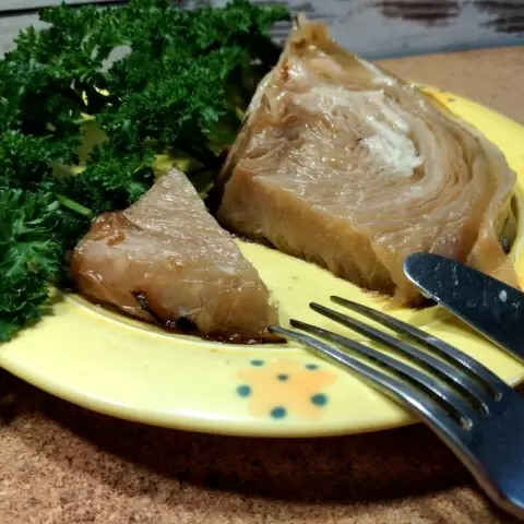 Для начала капусту следует нарезать на четыре части — это упростит дальнейшее запекание. Большие вилки лучше разрезать пополам, а затем нарезать пластами толщиной до 3 см. После этого стоит подготовить противень: застелите его пакетами для запекания, уложите капустные ломтики и добавьте 100 мл воды.