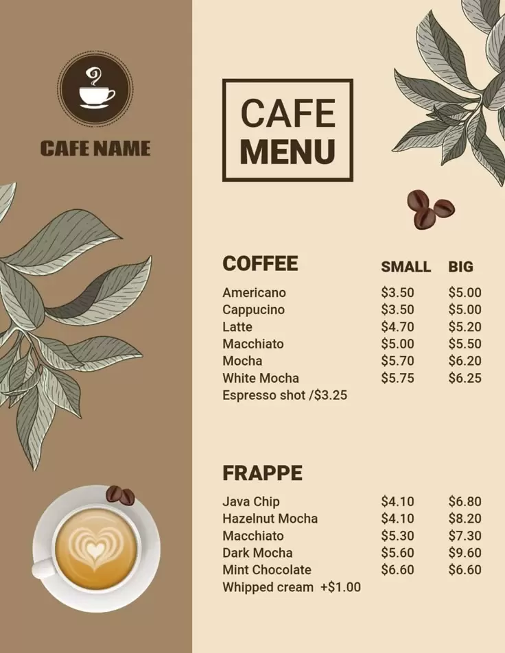 Так как кофе — натуральный продукт, многие кофейни стремятся отразить это в дизайне меню. Используются приглушенные природные цвета, такие как зеленый и бежевый, а также изображения кофейных зёрен и листьев. Меню обычно печатается на крафт-бумаге с простой и понятной структурой, где акцент делается на сезонные ингредиенты. Подобный стиль подойдет для «эко-кофейни» или «органик кафе».