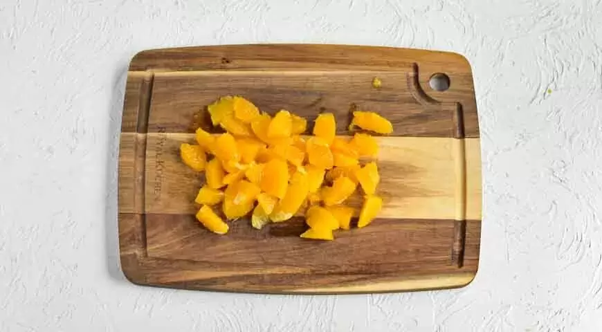 Для начала, тщательно промойте апельсины под проточной водой, используя щетку для удаления защитного воска. После этого обсушите их и нарежьте на восемь частей, удаляя при этом косточки и белую мякоть. Нарежьте дольки аккуратными тонкими кусочками.