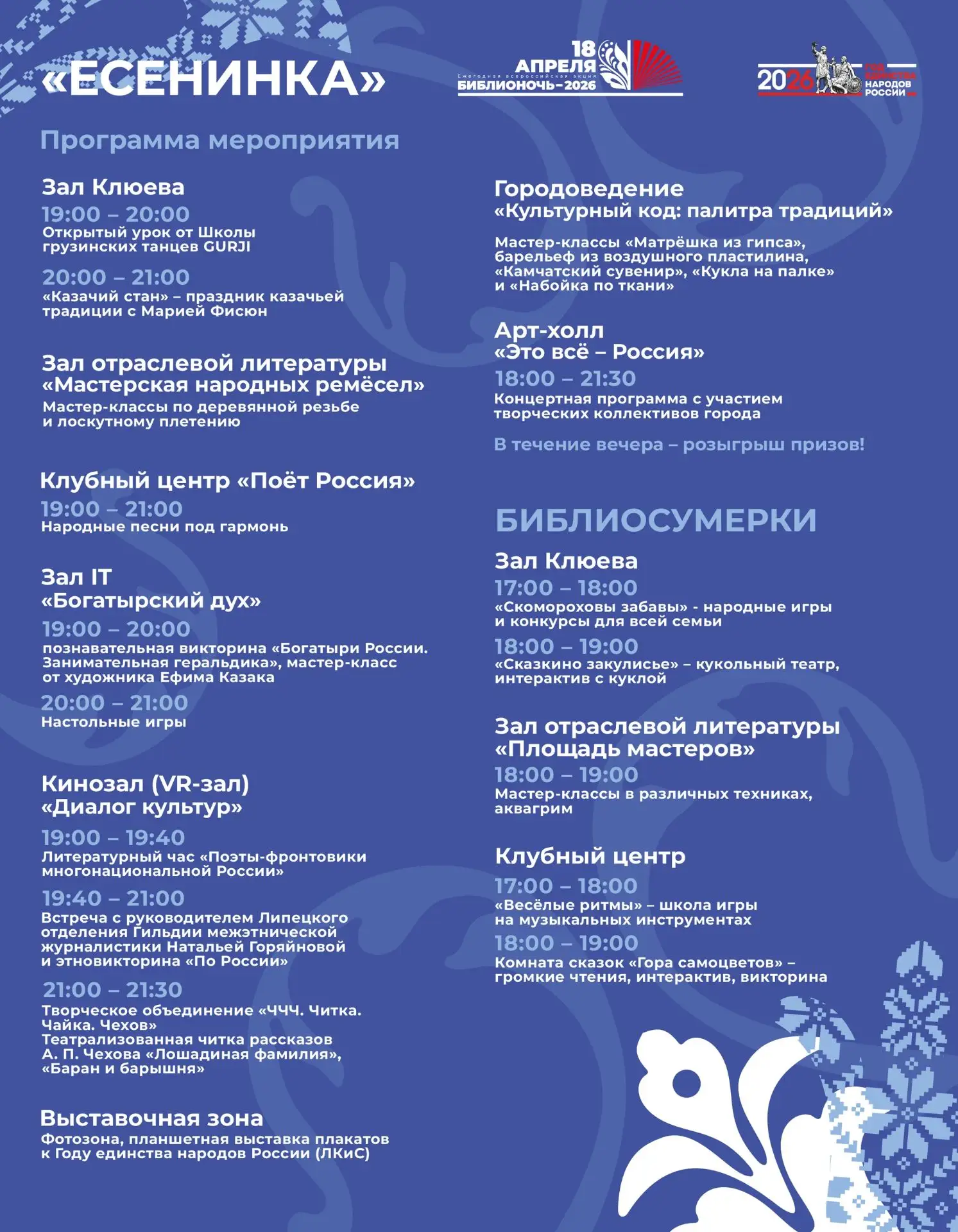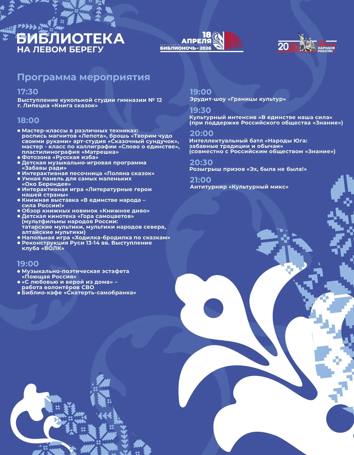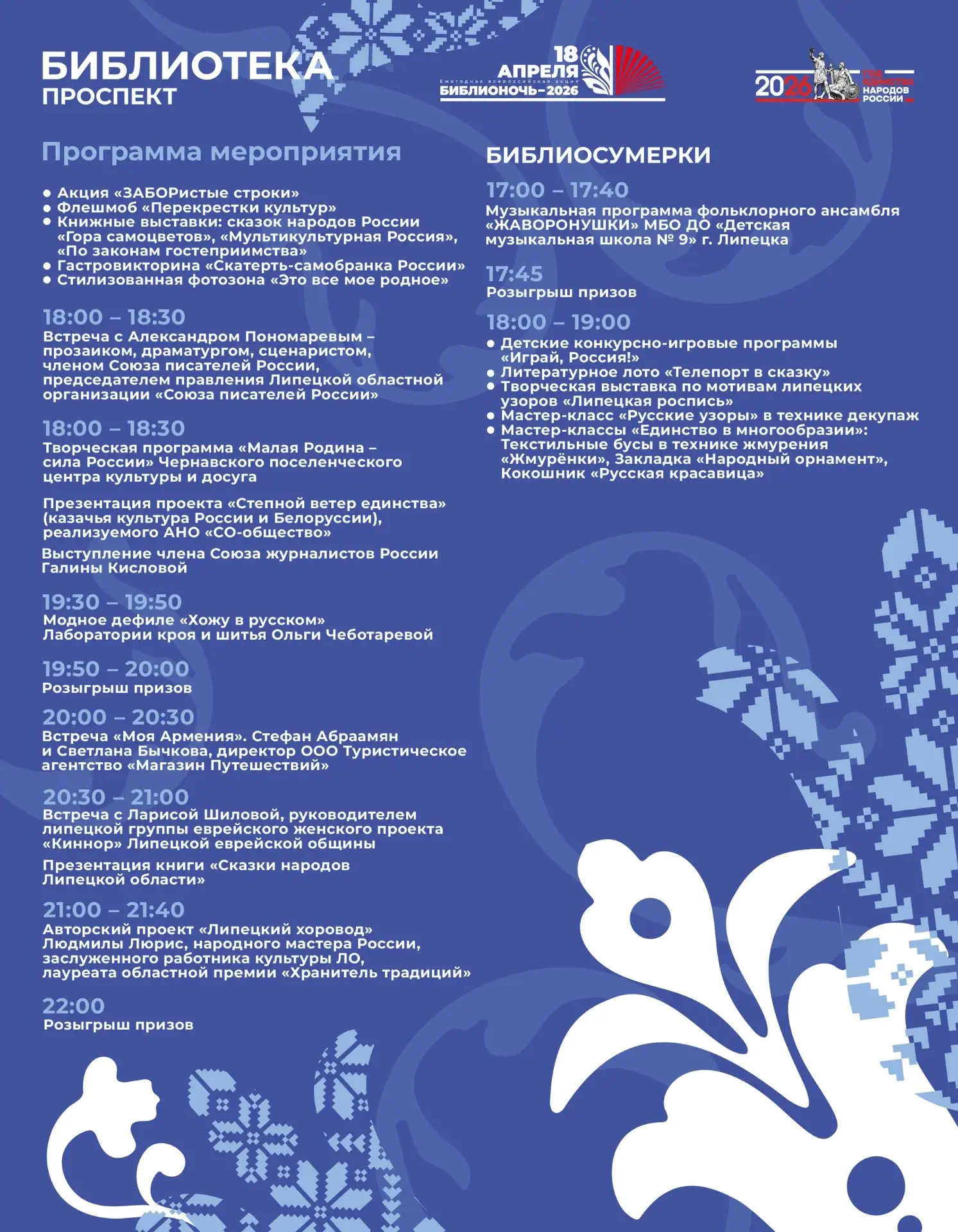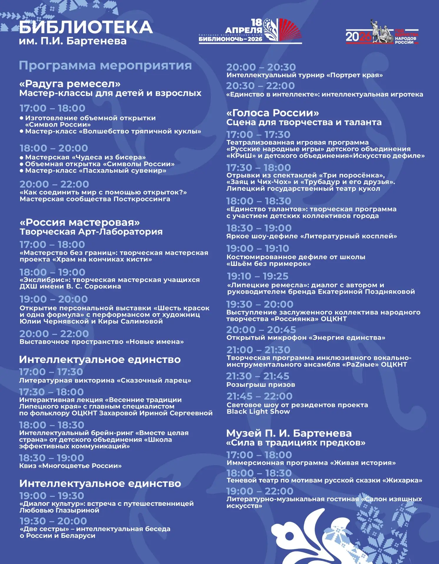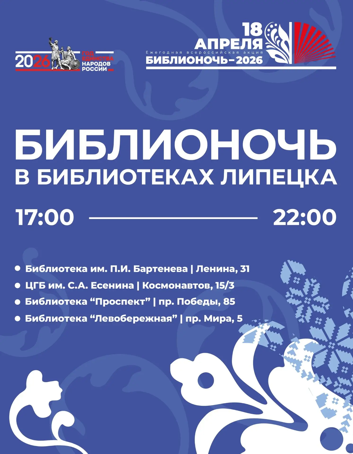 18 апреля в библиотеках Липецка пройдёт Всероссийская акция «Библионочь». В этом году её девиз: «Единство народа – сила России». А это значит, что вы сможете ближе познакомиться с культурой и литературой народов нашей Родины!