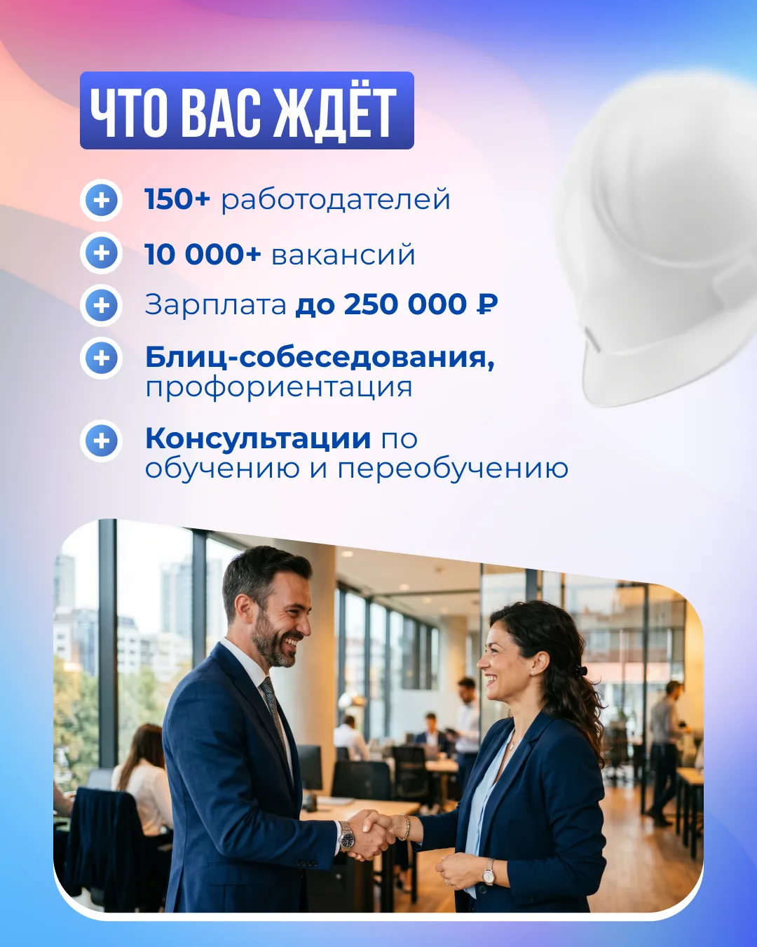 Рынок труда очень быстро меняется, поэтому прийти на ярмарку вакансий будет полезно не только тем, кто ищет работу. Если вы хотите развиваться, быть востребованными в будущем, то в нашей службе занятости помогут. Расскажут, какие специалисты ценятся и помогут с переобучением.