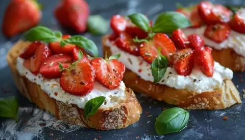 - Сборка: На каждый ломтик багета выложите слой рикотты, а сверху аккуратно разместите клубничные слайсы. Для завершения добавьте несколько листочков свежего базилика — они придадут уникальный аромат всему блюду.