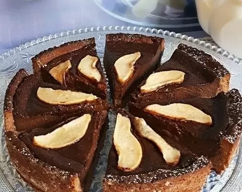Раскатать тесто в форме, смешать заварной крем с ганашем и вылить в основу. Украшать нарезанной грушей. Выпекать при 170°C около 40 минут. Дать пирогу остыть, нарезать на порции и подавать к чаю.