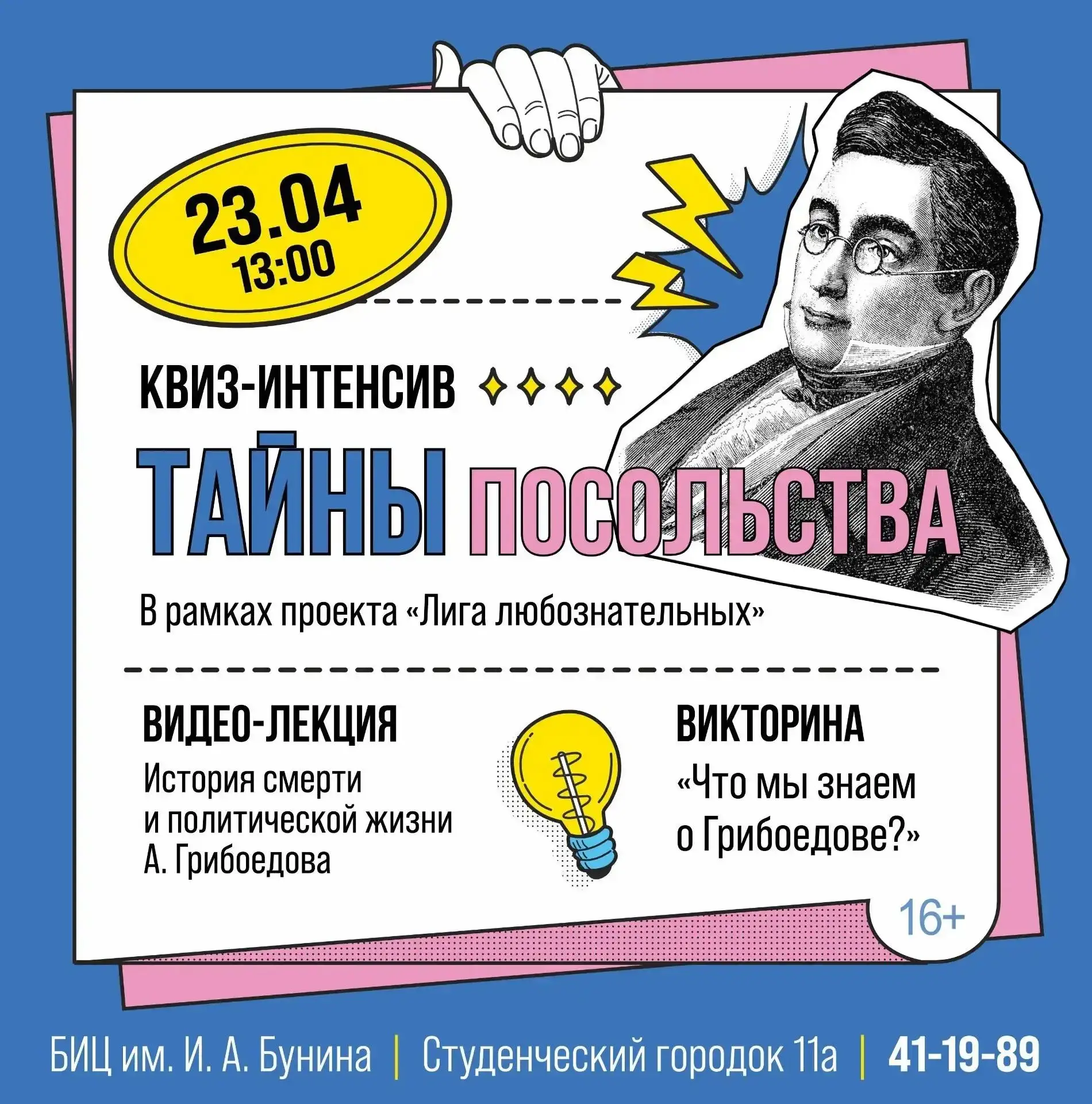 Он пройдёт в рамках проекта «Лига любознательных». В центре внимания – история жизни Александра Грибоедова.