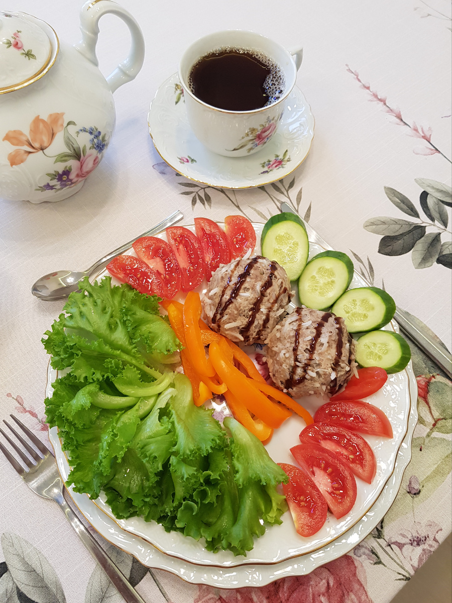 Готовые тефтели раскладывают по тарелкам и украшают свежими овощами: листьями салата, помидорами, сладким перцем и огурцами. Несмотря на простоту рецепта и небольшое количество приправ, тефтели получаются вкусными и сочными благодаря рису и луку. Для особого шарма можно добавить бальзамический соус, который придаст блюду легкую кислинку.
